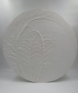 Rond. Dit is een grote gipsafdruk waarin misschien wel alle bloemen uit het boeket in verwerkt kunnen worden. Aangezien het een groot stuk is, is deze versterkt van binnen (onzichtbaar) met RVS platen waaraan de haken voor het ophangsysteem bevestigd is. Echt een eyecatcher voor in je interieur!